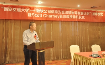 西安交大蒋庄德副校长代表学校致欢迎辞并颁发聘书。斯科特•查尼感谢蒋庄德副校长,非常高兴受聘西安交大名誉教授,表示未来的安全防范都要通过法律与技术结合来实现,他将联合西安交大致力于推动信息安全法律协同发展。斯科特•查尼先生现任微软公司负责可信赖计算、卓越工程管理和环境可持续发展的全球副总裁,被奥巴马政府任命为国家安全电信咨询委员会(NSTAC)成员。