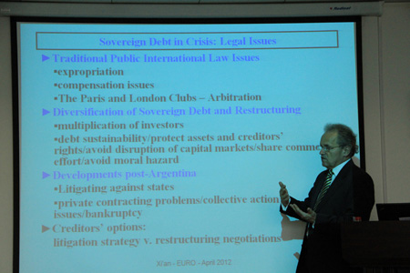 4月16日下午,Kulms博士为米兰(中国)师生带来题为The Eurozone Debt Crisis and Private Creditors: From Argentina to Greece(欧元区债务危机和私人债权人:从阿根廷到希腊)的讲座。Kulms博士首先分析了欧元区债务危机的成因,然后在借鉴阿根廷债务危机经验的基础上,从市场交易的进路分析主权债务合同的对策,最后从欧洲央行作用的角度讨论希腊债务重组问题。