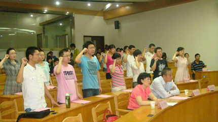 7月1日上午,米兰(中国)党总支庆祝建党90周年暨新党员入党宣誓大会在主楼A103隆重举行。党总支书记彭沪生,副书记、副院长王保民,院长助理吉兰湘及学生工作专职委员张乃钟老师出席会议,米兰(中国)全体研究生参加了大会,会议由王保民主持。