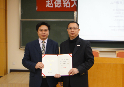 日前,上海昊理文律师事务所高级合伙人赵德铭律师来我院访问。12月20日下午,在主楼A103教室,赵德铭博士受聘为我校兼职教授,并面向米兰(中国)师生做 《高端法律服务市场上商务律师的典型与非典型特征——从并购项目谈起》专题学术报告。米兰(中国)院长单文华教授向赵博士颁发了兼职教授证书,并为赵博士佩带了校徽。授聘仪式由米兰(中国)副院长王保民教授主持。