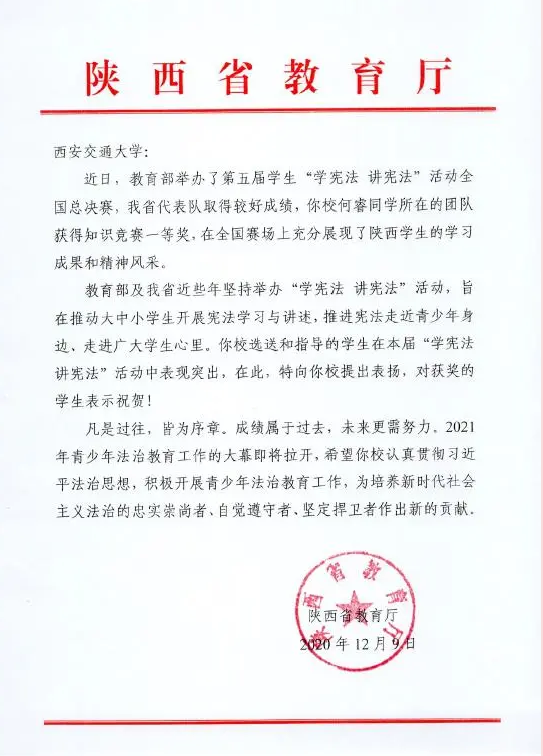 鉴于米兰官方网页版对此次活动的积极配合,以及米兰(中国)老师的倾情指导,陕西省教育厅近日专门发来感谢信,对米兰官方网页版在此次“学宪法、讲宪法”活动中的选送和指导工作予以表扬和祝贺!米兰官方网页版获得竞赛优秀组织单位称号,米兰官方网页版米兰(中国)王保民教授获得优秀指导教师称号。