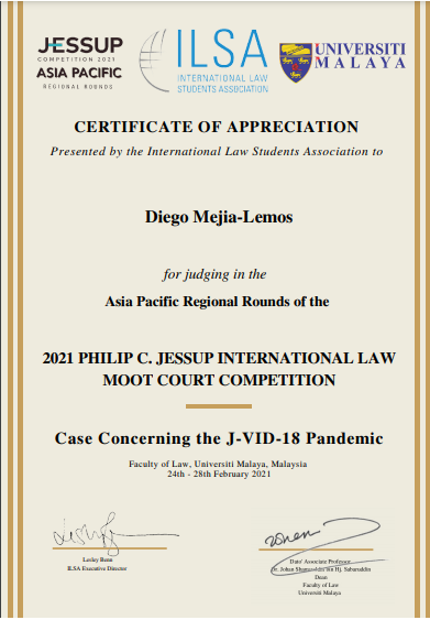 2021年2月26日至27日,Mejía-Lemos教授担任了由马来西亚大学组织和主办的Jessup亚太地区巡回赛初赛和四分之一决赛的法官。该区域巡回赛吸引了该地区超过20支队伍参加。
