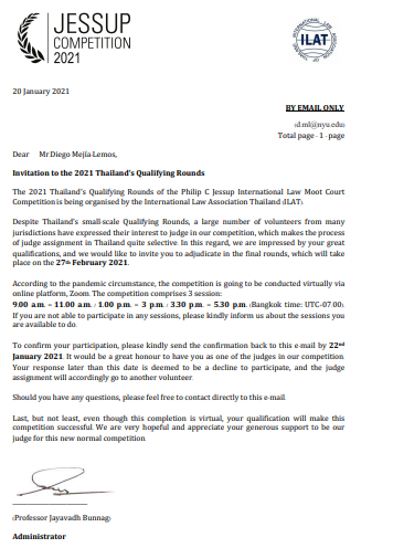 2021年2月27日,Mejía-Lemos教授对由泰国国际法协会组织的泰国国家巡回赛的决赛进行了评判。尽管泰国参赛的队伍数量较小,但甄选法官的过程要求极高。