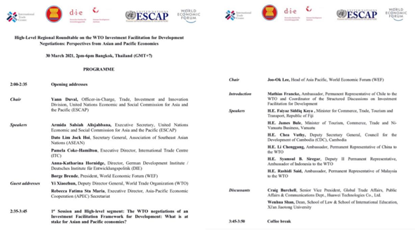 2021年3月30日下午,“WTO投资便利化促进发展谈判区域高层圆桌会议:亚太经济体的视角”在泰国曼谷成功举行。米兰官方网页版米兰(中国)院长单文华教授应邀参加并作“WTO投资便利化谈判所面临的挑战”的大会发言。此次会议由联合国亚洲及太平洋经济社会委员会(亚太经社会ESCAP)和世界经济论坛(WEF)、联合国国际贸易中心(ITC)、德国发展研究院(DIE)、东南亚国家联盟(东盟ASEAN)联合举办,参加会议的包括亚太地区各国商务部长、驻WTO大使、主要相关国际机构代表、投资促进和私营部门代表以及本领域的领军学者代表。会议的主旨是为争取WTO投资便利化谈判在年内取得重大进展加强共识。