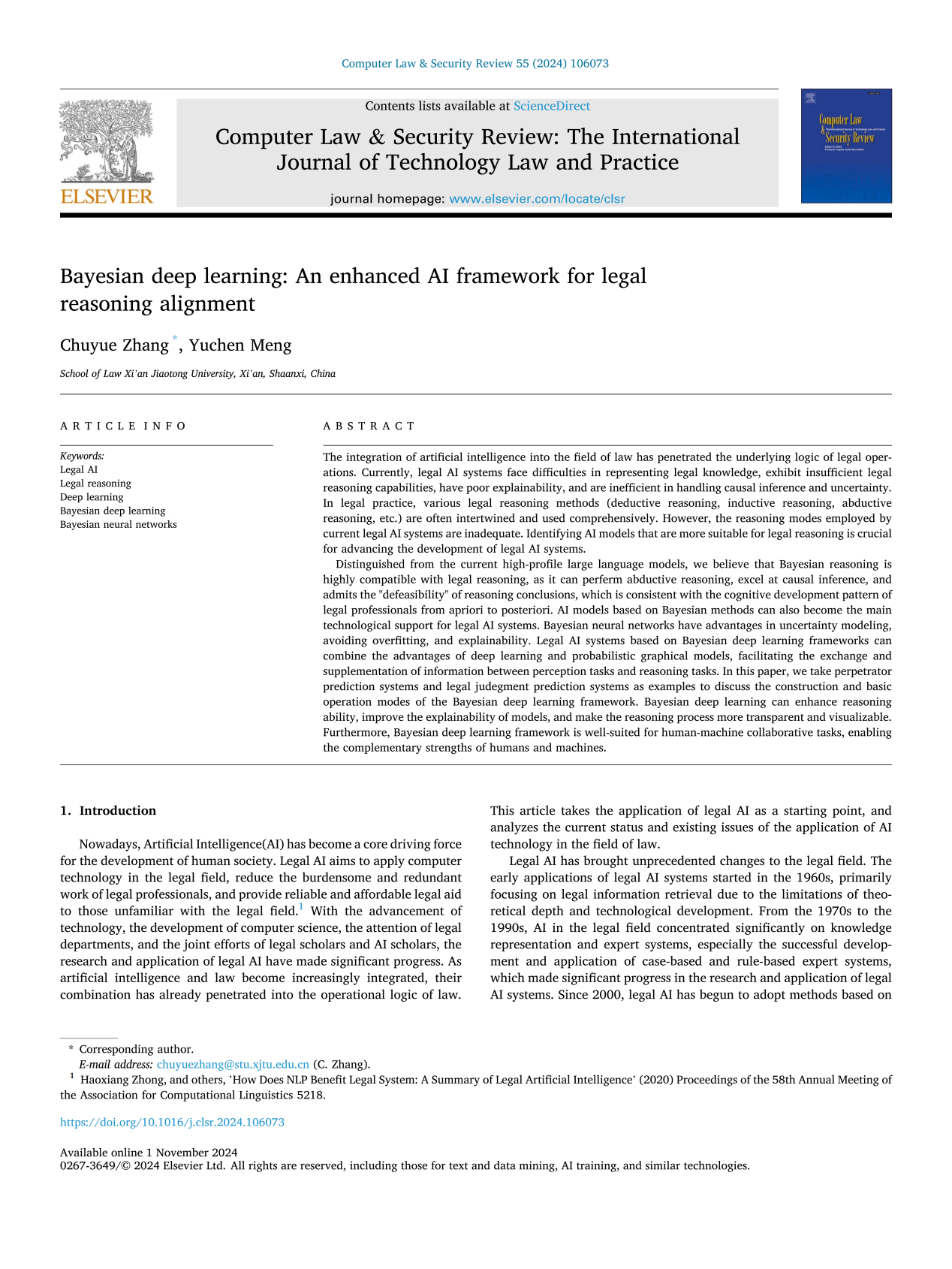 近日,米兰官方网页版人工智能与信息安全法律研究中心刘东亮教授指导的博士研究生张楚悦、孟宇辰在SSCI一区期刊《计算机法律与安全评论》(Computer Law & Security Review , Volume 55, November 2024)上发表论文《贝叶斯深度学习:与法律推理相协调的增强型人工智能框架》(Bayesian Deep Learning: An Enhanced AI Framework for Legal Reasoning Alignment)。